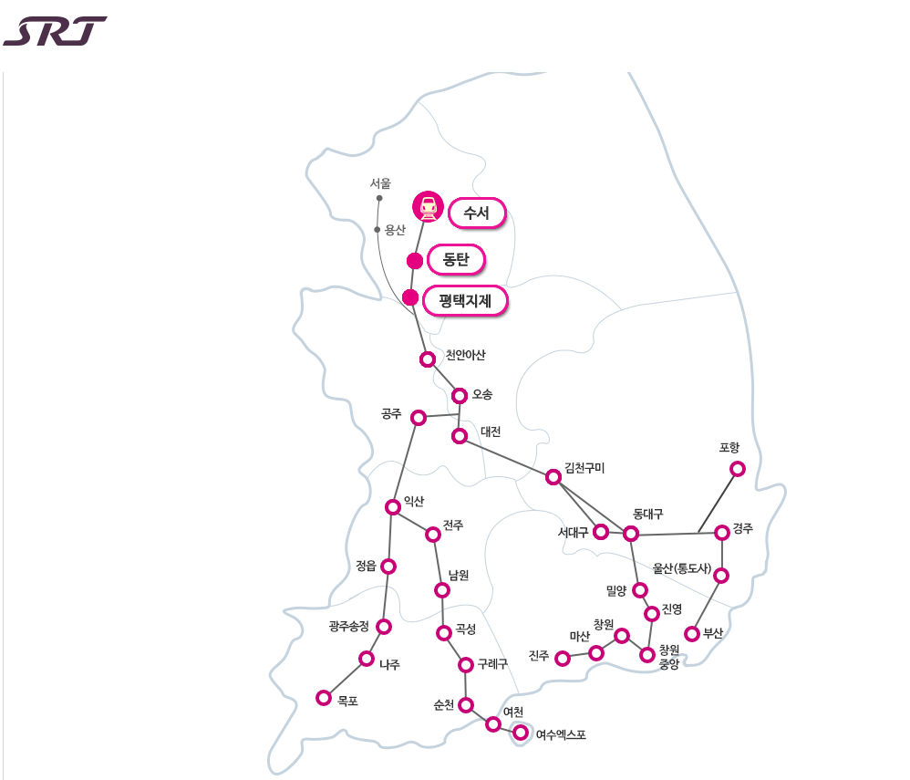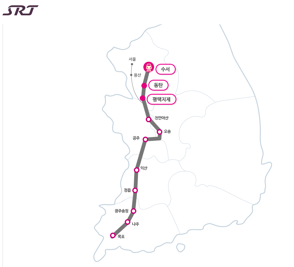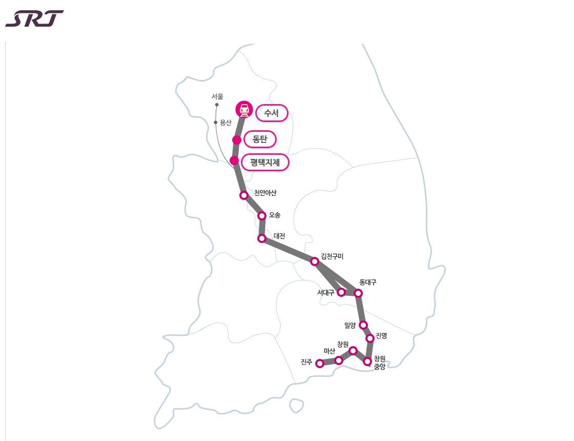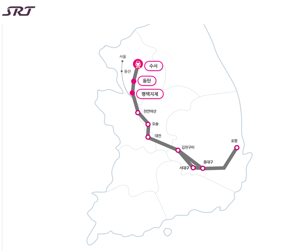 SRT(수서고속철도)는 서울 수서역을 기점으로 부산, 목포 등 주요 도시를 연결하는 고속철도 서비스입니다.  빠른 속도와 합리적인 가격으로 많은 이용객들이 선호하는 교통수단인데요.  이번 글에서는 SRT의 주요 노선 및 각 노선별 소요 시간을 정리하여 안내해 드리겠습니다.  또한, SRT 공식 홈페이지의 자료를 적극 반영하여 신뢰도 높은 정보를 제공해 드립니다.  1. SRT 주요 노선 및 정차역SRT는 크게 경부선과 호남선을 따라 운행됩니다. 각 노선별 주요 정차역은 다음과 같습니다.✅ 경부선 (수서 ↔ 부산)노선정차역경부선수서 → 동탄 → 평택지제 → 천안아산 → 오송 → 대전 → 김천(구미) → 서대구 → 동대구 → 신경주 → 울산(통도사) → 부산 SRT 경부선 – 노선, 정차역 (부산,대전,동대..