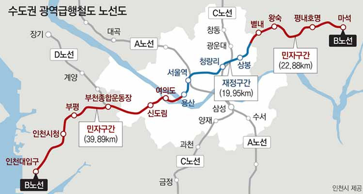 현재 계획 및 운영 중인 GTX 노선은 A,B,C가 있습니다.
