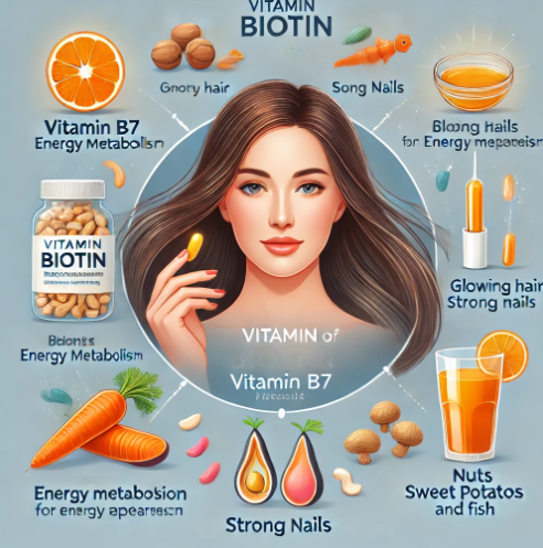 비타민 B7(바이오틴)은 머릿결과 손톱 건강을 유지하고 전반적인 에너지 대사를 지원하는 필수적인 영양소입니다.